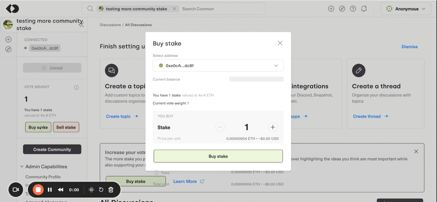 - To support the community's ideas, you can acquire stake by depositing ETH into the community bonding curve. At the moment, they’re not transferable. They reflect your commitment to the community. Each transaction includes a fee, with 5% going to the community treasury and 5% to the platform.
